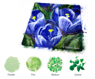 Frit comes in various particle sizes because different projects require it. Many artists build color solely with powders, while others might use the full range of particle sizes within a painting or project. When entire scenes are created from Frit, we call the work a Frit Painting. Most colors are produced in all four particle sizes.