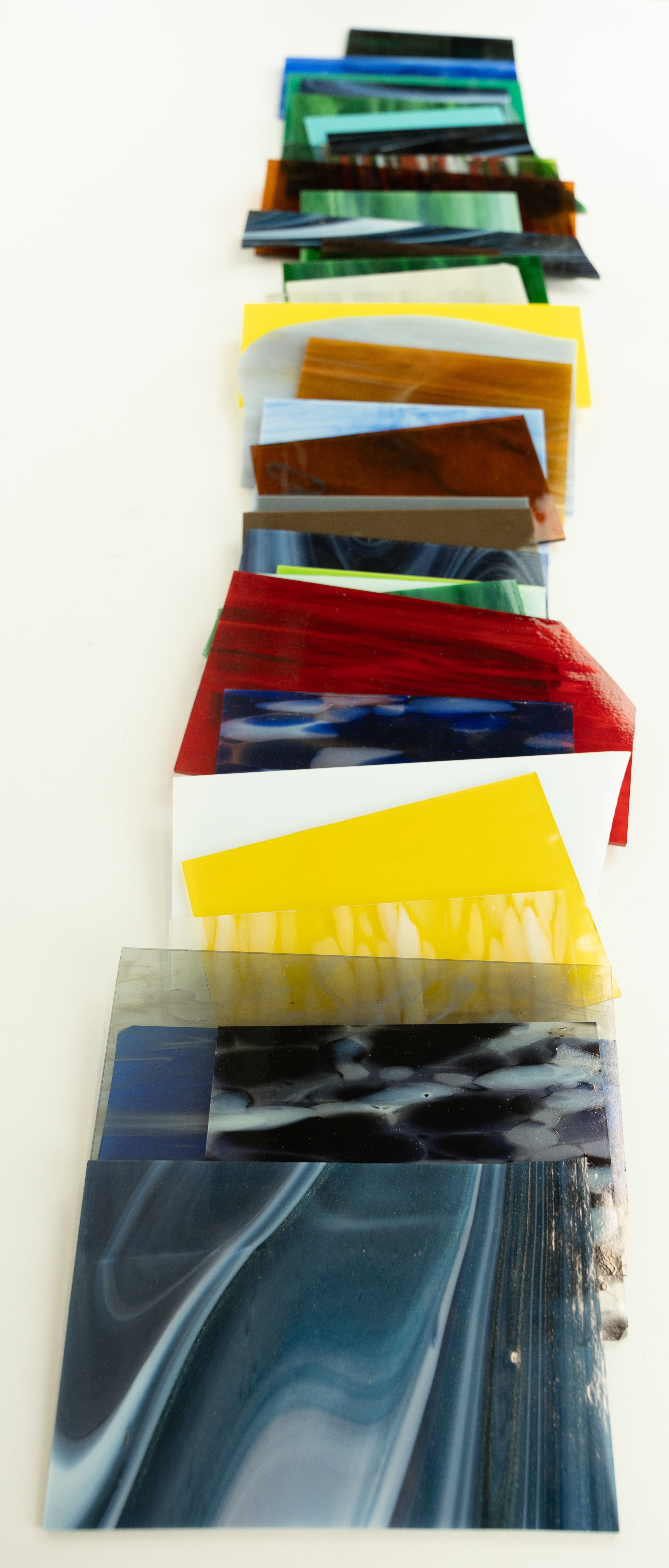 Glass breaks. It’s a fact that glass-lovers know all too well. It used to be nothing but bad news when our lovely sheets broke around here, but we’re flipping the script now! Instead of chalking it up to a loss, our damaged sheets are now being cut down and bundled into “surprise packs” of smaller, yet usable, pieces. When we accumulate enough broken glass, we will create as many Scrap Packs as possible and offer them up on a first come/first served basis.