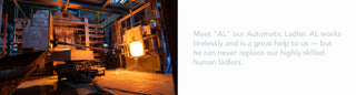 To create multi-colored glasses, the desired secondary glass colors are melted in separate smaller furnaces. The additional molten glass is then ladled into the base stream just ahead of the stirring bay, where the different glasses are carefully stirred together by a skilled operator using a hand-held rod. Of course, both the timing of the ladling and the stirring technique are critical to the end result, and vary for different products. Our popular "Wispies" are made by ladling small amounts of white opal into the flow of a transparent color base. The more opaque varieties are just the opposite—small amounts of transparent color are ladled into a flow of opal glass. To get just the right mix, ladlers pour at carefully timed intervals, watching clocks equipped with timing lights to cue their movements.