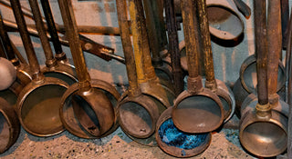 Color is created as part of the basic raw batching materials. Virtually any metallic oxide creates color in glass. Some of the most common include: cobalt (some Blues), copper (some Blues & Greens), manganese (Purples), sulfur (Ambers) selenium (Reds & Oranges), cadmium (Yellows), chrome (some Greens), fluorine (White opal) and nickel (Gray).