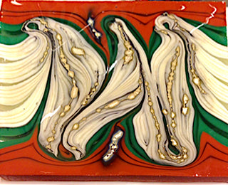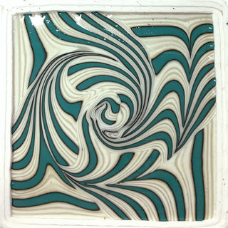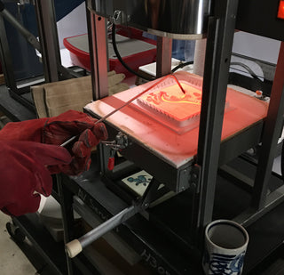Once the kiln reaches 1660º F, I begin combing. Iturn off the kiln just prior to opening the door of the kiln, and begin the combing process. I use two combing rods which allows me to pull and push the glass strips simultaneously and I can also manipulate the glass more before the glass stiffens (gets too cold to comb). After each combing I shut the kiln, turn power back on and wait for the temperature to reach 1660º F and repeat the combing of the glass until the desired pattern is achieved.