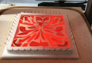 When I work in larger kilns that can accommodate standard 20" kiln shelves, I normally use 18" long x 1/4" wide glass placed on-edge atop a base of 18" x 18" clear glass. For the small 8" kilns, I use a 7" square shelf and make the strips ⅜" or ½" by 5 ½" without a clear base. For these smaller combings I use 1/8" thick ceramic fiber strips, wrapped around the glass three times (strips are ⅜" wide lined with ⅜" strips of Papyros that are secured with Elmer’s Glue®). I use stainless steel Bridal Lace sewing pins to secure the fiber around the glass to create a dam.(See images on following pages that show this damming technique.) Stainless steel square or round rings lined with ⅛" ceramic fiber + Papyros (secured with Elmer’s Glue) work well also for damming a combed piece.