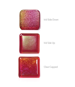Since the irid coating on the surface does not melt during fusing, it resists bonding. If you were to try to fuse two iridized surfaces facing one another, they will not bond well, if at all. There just isn’t enough glass surface available to create the bond.