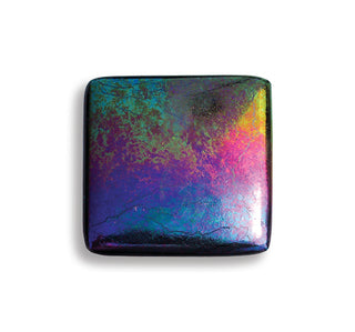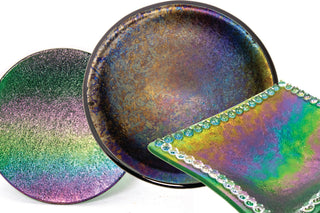 Our iridescent glasses have been flash-fired with a micro-thin layer of metallic crystal creating a reflective surface that shimmers in rainbow, silver, or gold tones. Because of its metallic nature, the coating has specific characteristics that are important to understand as you plan fused glass projects. Below, you will find information, tips, and ideas to help you achieve your fusing goals using Oceanside Compatible iridescent glasses.